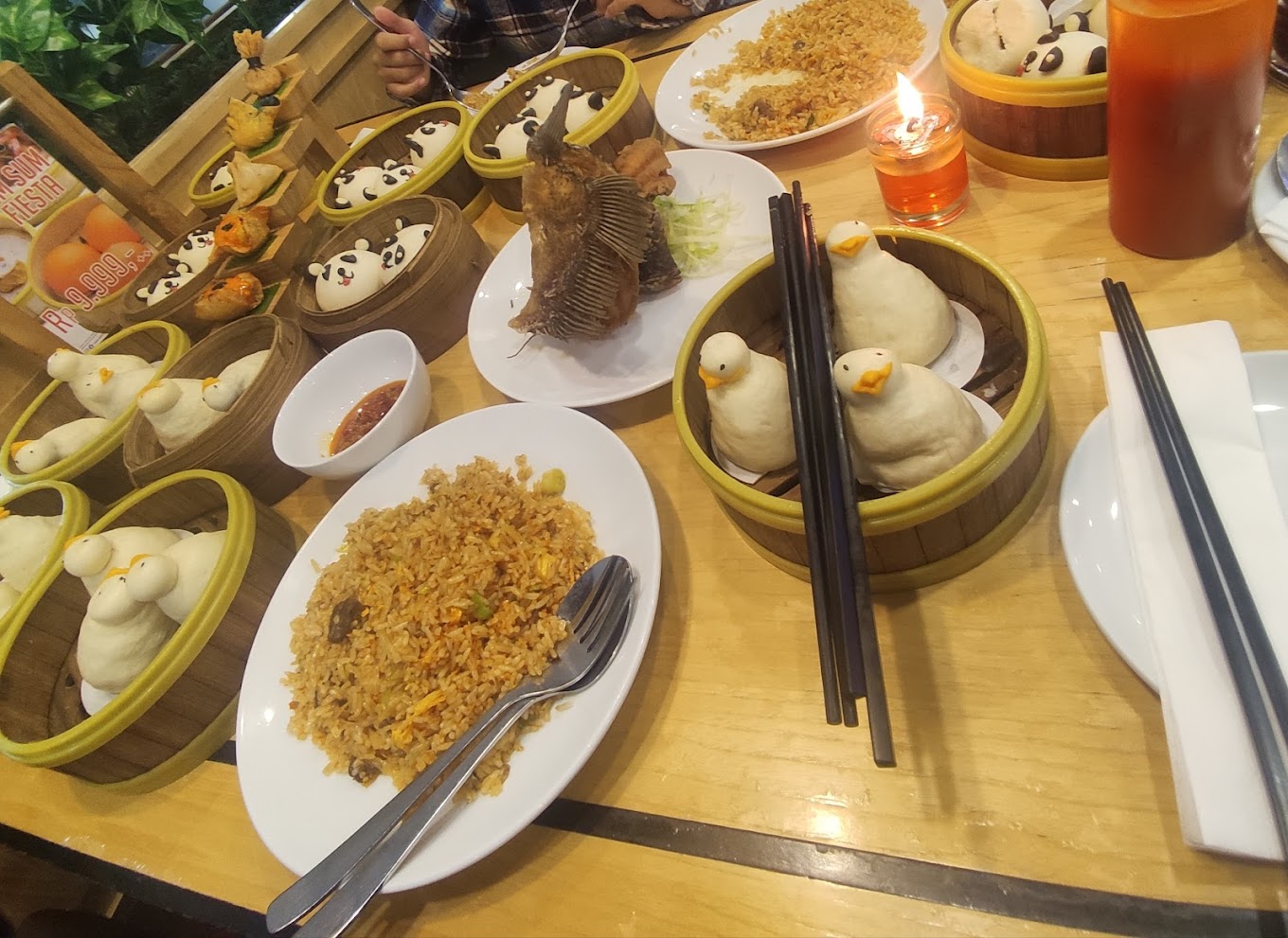 Selain Dimsum khas kami, nikmati hidangan khas kami seperti ayam goreng pedas dengan bawang putih, bebek panggang, tahu buatan sendiri dengan jamur shimeji, tumis Kai-lan dengan dua variasi, dan banyak pilihan rekomendasi koki dan minuman.